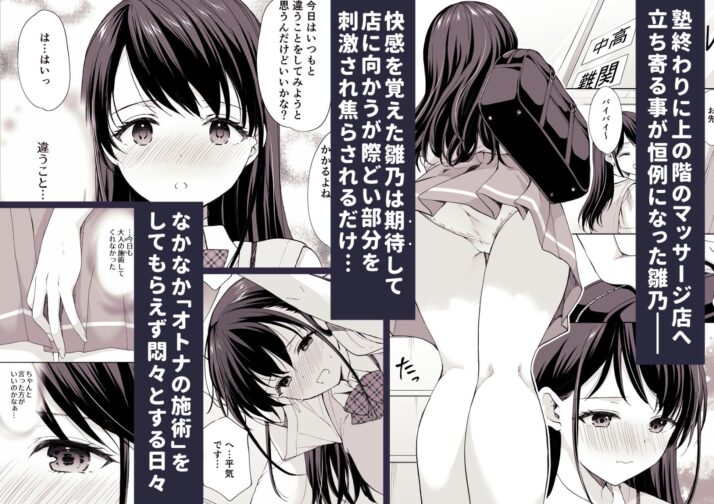 塾の終わり、上階のマッサージ店に立ち寄るのが恒例になった 雛乃。 整体師の手技で勉強疲れを癒してもらう日々。 今日もバランスボールを使った新しい施術を受けリフレッシュ。 しかし、以前受けた「オトナの施術」で覚えてしまった性的な快楽が忘れられない 雛乃 は、 時々触れる際どい部分の刺激に、期待しては焦らされ悶々としてしまう。 そんなある日、家電量販店でよく見かける有名な電動マッサージ機を使った施術を受ける。 肩や腰をほぐしながらだんだん疼いてくる股間。 「ーここに当てたらどうなるんだろう……」 逡巡する雛乃に整体師はイケない使用方法をレクチャーする。 それは序章に過ぎなかった。 身体に火を付けられた雛乃は、見たことのない器具‘クリトリス吸引バイブ’をあっさり受け入れ、 初めて味わう鮮烈な快感に何度も絶頂に達してしまう。 そして限界を迎えた雛乃はついに自ら「オトナの施術」を懇願する。 「コンドームを切らしていて今日は出来ない」と言う整体師に 答えた雛乃の理性は完全に失われていたー。 ※女の子が嫌がったり痛がる描写はありません※ ※「塾の上のマッサージ屋さん」の続編になりますが今作からでもお楽しみいただけます※ ****************************** 本文漫画50ページ 表紙下着&ロゴなしVer.イラスト収録 タイトル:塾の上のマッサージ屋さん‐吸引連続絶頂編‐ サークル名:いもむや – Singleton 作家名:あずまゆき