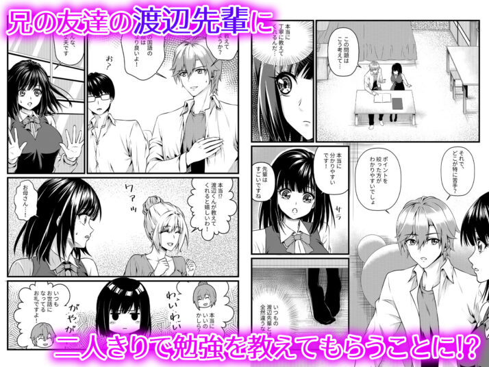 兄の友達・渡辺先輩は我が家で一緒に夕飯を食べる程の仲。 今日もみんなで食事をしていると、母からテストの点数を聞かれてしまう。 思わず動揺する美羽だったが、なんと後日渡辺先輩から勉強を教えてもらえる事に…! 数日後…学校から帰ってくると、玄関先で渡辺先輩と出会う美羽。 渡辺先輩の丁寧な教え方に感動しながら勉強していると、 母も兄も家にいないからか、二人はだんだんと距離が近くなっていく。 するとふとした拍子に渡辺先輩からキスをされ、そのまま服を脱がされてしまい…。 「最初から…このつもりだったんですか?」 「美羽ちゃんだからだよ…」 普段と違う先輩とのキスで濡れてしまった美羽は、 そのままベッドで渡辺先輩を受け入れてしまう。 先輩からの優しく丁寧な愛撫に興奮を隠しきれなくなった美羽は、 やがて積極的に求めだして――