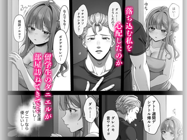 彼氏持ちの少女(処女)が、ホームステイに来たデカチン留学生に身体を開発される話 ———————————————————————— ▼あらすじ 長年の幼馴染の関係を経て、ようやく隣に住む同級生・慶介と付き合い始めた真千子は、 初体験を前に、彼と些細な喧嘩をしてしまった。 気持ちが落ち込む真千子。 そんな彼女の部屋にホームステイ中の外国人・ダニエルが訪れ、 リラックスするというアロマを嗅がせるが、実はそれは催淫効果のある媚薬で 真千子は朦朧としたまま、ダニエルに処女を奪われてしまう。 さらにダニエルはその一部始終をスマホで録画しており、慶介に知られたくなければ 自分が帰る1週間後まで身体を使わせろと迫るのだった― ▼登場人物 ・真千子(マチコ) 愛称:まちこ 身長156cm 処女 大人しく真面目な女の子。 部活は英会話部に所属しており、将来海外で仕事をするという夢を持つ。 両親はその夢を応援しており、真千子の為にと、この夏外国人留学生・ダニエルを受け入れた。 幼馴染で同級生の慶介とは家が真隣で、◯校入学と共に彼氏と彼女の関係になった。 ・慶介(ケイスケ) 愛称:けいちゃん 身長168cm 童貞 真千子の彼氏であり幼馴染。真千子の家とは昔から家族ぐるみで付き合っており、 どちらの両親も二人の関係を微笑ましく見ている。 ◯校に入り、周りの友達が童貞を捨て、どんどん大人になっていくことに焦りを覚え始めている。 ・ダニエル 愛称:ダニー 身長:182cm 巨根ヤリチン 真千子の家に、夏休みの間だけ短期ホームステイにやってきた外国人。 一見フレンドリーで気さくに見えるが、狡猾で人一倍精力が強くセックスが大好き。 特に日本の女性とヤルのが好きで、それを楽しみに留学してきた。 ———————————————————————— 作画:nama 表紙+モノクロ本文44ページ+おまけ