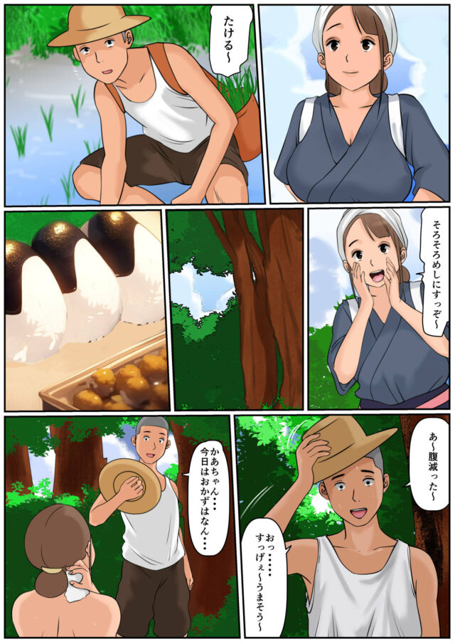 ぼくのかあちゃん3 登場人物 宮本ゆきえ 宮本たける (旧姓)宮本さなえ (新姓) 竹口さなえ 浜口りこ 浜口剛三(りこの父) 主なストーリー たけるが実家へ帰省してきてすぐの話。、たけるは母(ゆきえ)の畑仕事の手伝いで、毎日ゆきえと畑へ出向いていた。畑へ向かう途中、姉の(さなえ)から電話がかかってくる。 トラックを道の端に停め、ゆきえとさなえが話を始める。 話てる最中、タケルがふと外に目をやると、草むらの向こうに2人の男女に 目が止まった。見えたのは近所の浜口家の娘とその父親だった・・・ しばらく、様子を見ていると、娘と父親が近親相姦を始めてしまう。 よく見る光景だった・・・・ 娯楽施設も何もないこの村で、唯一の楽しみは男女の営み しかなかった。そのうち親子でやる家も多くて 青姦を目にすることはそう珍しい事ではなかった。 それを見てしまったタケルは、自分に重なった気がしてしまい。昼のご飯休憩後に ゆきえからの誘いに躊躇しながらも、周りに誰もいないことの 安心感・開放感から、ゆきえと始めてしまう。 「たける、な〜んも気にせんでええ、この村じゃあ、親子でやることなんて めずらしいことじゃねぇんだから・・・」 「かあちゃん・・・・」 作品の詳細 表紙 1P おまけ 1P 登場人物紹介 1P 本編 59P 合計 62P
