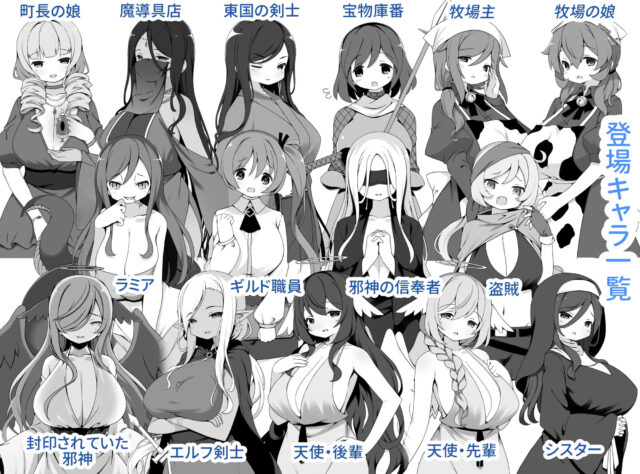 勇者×NPC(モブ)が中心の ファンタジーRPGモチーフの3コマ漫画集。 登場人物はみんな勇者に優しいor即落ちします。 年上多め、全員巨乳で全員妊娠します。 ストーリーは一応続きモノですが、 過去作に触れていなくても楽しめる内容かと思います。 おまけで巻末にボテ腹H集が入ってます。 (他の絵の差分のような形) 【登場キャラクター】 ・兵士 ・東国の剣士 ・牧場の母娘 ・盗賊 ・魔導具店 ・町長の娘 ・ラミア(魔物) ・ギルド職員 ・邪神の信奉者 ・シスター ・天使二人組 ・エルフ剣士 ・封じられていた邪神 ページ合計53P (本編30P、その後の話16P、ボテH集7P) ※内容の大半は過去にツイッターやpixivにアップしたものと同様のものです。 あらかじめご了承いただければ幸いです。