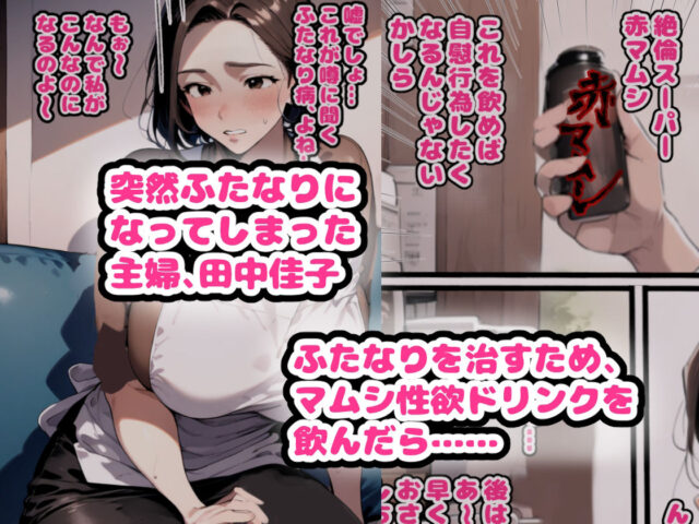 ■作品内容 突然ふたなりになってしまった主婦、田中38歳。 ふたなりを治すため、マムシ性欲ドリンクを飲んだら…… ちんぽの勃起が限界突破! おちんぽの快楽に酔いしれる彼女は、理性を忘れ公園で露出オナニー。 さらには寄ってきた子○もに……? 性欲は止まるところを知らず、PTAの奥様方と濃厚百合セックス!!! 性欲に溺れたふたなり主婦の淫乱さをどうぞご覧ください。 ■作品構成 マンガとCGを組み合わせた作品となります。 ・本編104P ・上記の文字無し差分104P ・おまけCG24枚 の合計232枚でお届けいたします。 ※それぞれのPDFも同封されています。 /浮気/NTR/食ザー/寝取られ/アへ顔/ザーメンゲップ/陰毛/ぶっかけ/母乳/などの要素を一部含みます。苦手な方はご注意くださいませ。 ※本作はAI生成画像を加筆、修正した作品となります。