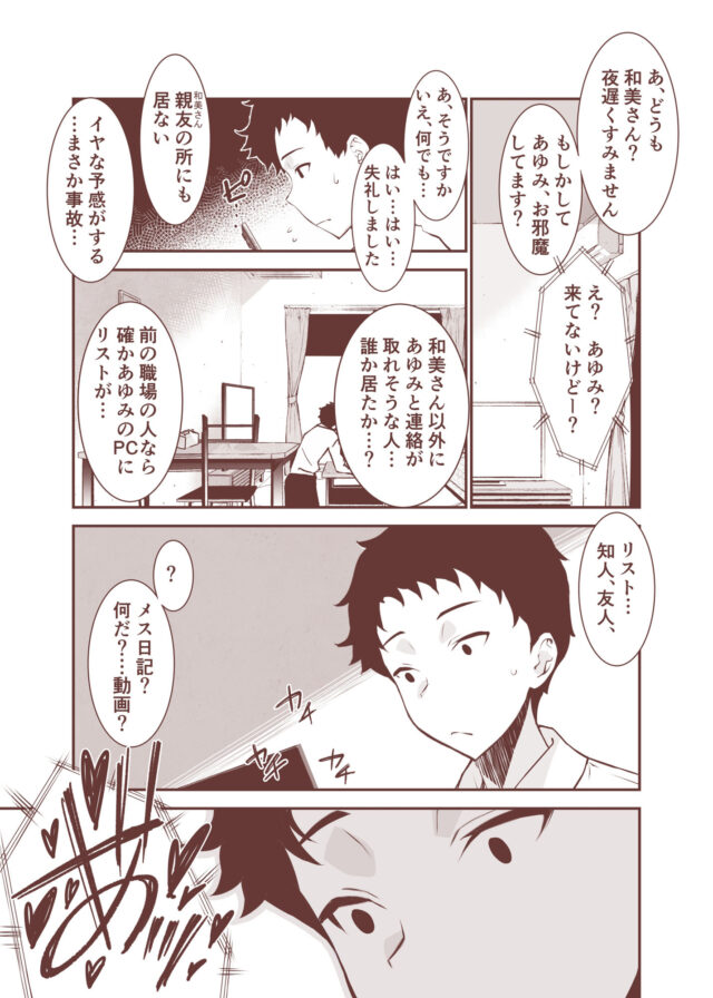 ————————————————————————————————- 「寝取られ」好きが「寝取られ」好きのために作った、ド直球「寝取られマンガ」! 大ボリュームおまけ付き・総梱数、147P!! (モノクロ本編 64P おまけ:CG基本絵 7枚/差分込み 36枚 & 表紙別Ver 11枚) ————————————————————————————————- <<あらすじ>> 結婚3年目の愛妻家のたかし(主人公)は、ふとした切っ掛けで、妻(あゆみ)のPCを覗き見てしまう。 そこには、自分が知らない男と、欲望のままにセックスする愛妻の姿が、動画として記録されていた。 ひょっとこ顔でバキュームフェラ。 失禁。 潮吹き。 オホ声アクメ。 アヘ顔で絶頂。 ゴムなしセックスで膣内射精。 見た事のない痴態を晒す愛妻の姿に、たかし(主人公)は打ちのめされる。。。 ———————————————————————————————– 【「寝取られ」好きな方に是非、見て欲しい】 ・好きな子が自分以外の男とセックスしてるなんて、むしろゾクゾクする。 ・失恋の思い出の心の痛みと重なって、逆に興奮する。 そんな「寝取られ」好きの皆さん 是非、淫欲人妻あゆみちゃんの可愛い痴態と 愛妻に裏切られて絶望する主人公たかし君の心痛をご堪能ください! ———————————————————————————————– 【NTRが本当に好きなかた以外は購入しないでください!】 ※こちらは「‘寝取られ済みの妻’に絶望する夫」視点のNTR漫画です。 ※「妻が寝取られる過程」の描写は、一切ありません。 過程をご覧になりたい方は「愛妻、堕ちる2」をよろしくお願いします。 ※「寝取られ作品」が好きではない方は、不快に思われる可能性があるので購入はおすすめしません。 ———————————————————————————————– 【収録内容】 ・タイトル表紙 1P ・コミック本編 58P ・ヒロイン設定ラフ画 1P ・次回予告 2P ・あとがき 1P ・裏表紙 1P (本編:64) 〜オマケ:1〜 ・プロローグ・ストーリー・ミニCG集 基本絵7枚 / 差分込み36枚 文字無し差分36枚 (計72枚) 〜オマケ:2〜 ・表紙/文字無し版 1P ・表紙/差し替え前Ver 2P ・表紙/差し替え前(文字無し) 2P ・パッケージイラスト/高解像度版 1P ・パッケージイラスト/高解像度版(文字無し) 1P ・パッケージイラスト/差し替え前Ver・高解像度版 2P ・パッケージイラスト/差し替え前Ver・高解像度版(文字無し) 2P (計11枚) ◆ 総ページ数:147 ◆ ———————————————————————————————– ◆性器修正 黒ヌリ ◆JPEG版&PDF版、2種同梱 ———————————————————————————————– ★☆★ 今だけ無料!!★☆★ おまけ(プロローグ・ストーリー・ミニCG集)前半19枚を「期間限定」で無料公開中! 今すぐ「体験版」で是非ご覧ください! (無料公開、終了しました) ================================================================================================ ※レビュー募集中 今作は、当サークル初のオリジナル創作DL同人コミックになります。 気に入った点、良かった所、ご希望など、レビューを頂ければ 次回以降の参考にさせていただきます。 是非、ご感想よろしくお願いします! 作者のやる気アップと次回作品のクオリティアップにも繋がりますので ファン登録も、どうぞよろしくお願いします!