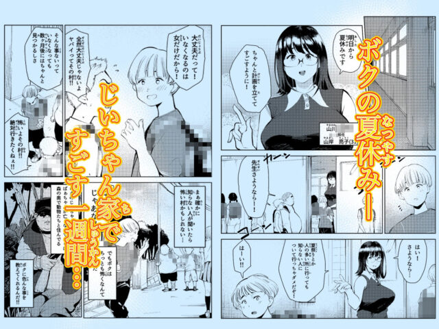 いよいよ始まる夏休み ボクは田舎のじいちゃんの家に遊びに行くことに… これは皆にはナイショなんだけど、じいちゃんの家では色んな動物を飼っていて じいちゃんによって完璧にしつけられてるんだ。 一年ぶりに遊びに行ったら僕のためにメス牛を新しく飼ってしつけてくれてたんだけど このメス牛がボクの憧れ、クラスの担任の山岸先生(31歳)でボクはすごく興奮したんだ! それでじいちゃんの家にいる一週間は、ボクがこのメス牛の世話係になったんだけど 餌をあげたりお風呂にいれたり、裏山を散歩させて外でおしっこさせたり このメス牛は大人のメスで発情期だからチンチンを使って大人しくさせたり 動物の世話はとにかく大変なんだけど 田舎には都会にはない良さがあるんだ!