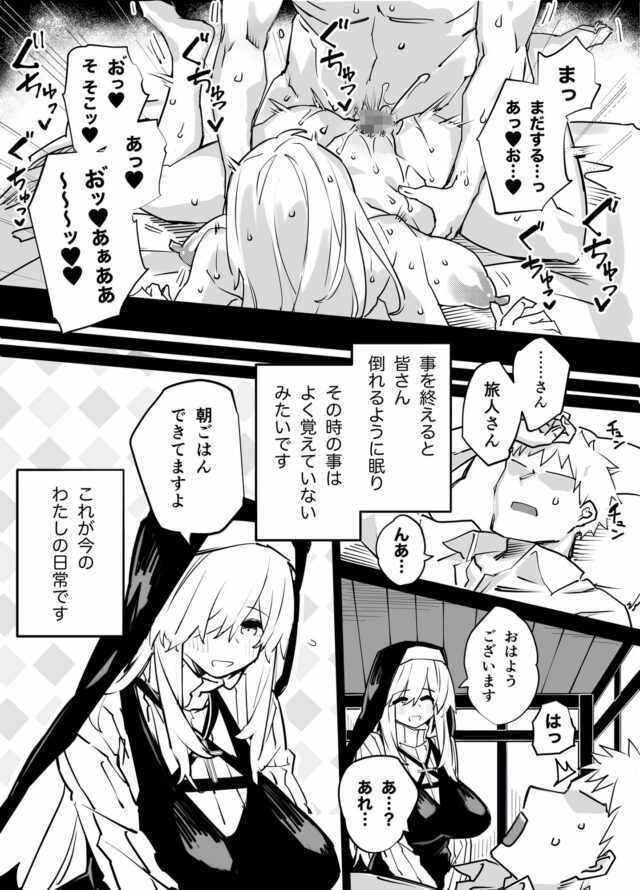 小さな教会に身を置くシスターノエロは街では知らない人はいない美人で爆乳のシスターさん。 近頃シスターと会う人はみんな様子がおかしく突然我を忘れて襲ってくるようになってしまった。 そんな人々の欲望をシスターがひたすら受け止めるヤラれ放題のエッチな日常。 モノクロ36ページです。