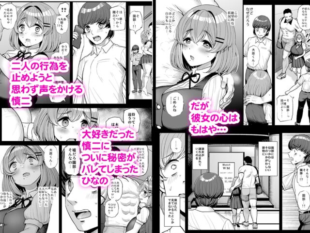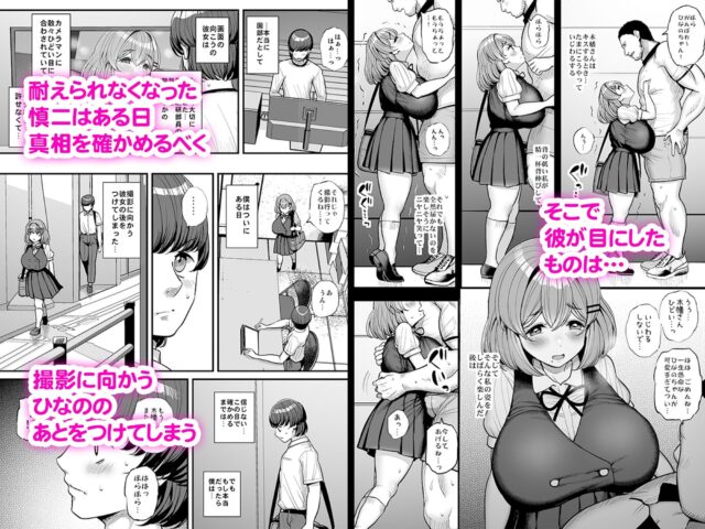 とある漫画研究会 大原慎二は、そこに所属する絵描き 彼の夢はプロの作家になること 園部ひなのは、そこに所属する唯一の女子部員 大人しく 背は小さく しかし胸はとても大きな彼女の趣味は、アニメキャラクターのコスプレをすること 二人はお互い密かに好意を抱いていた。 だがひなのには 慎二にも 部員の皆にも言えない うしろめたい秘密があった。 それは 自分のコスプレ撮影を手伝ってくれているカメラマンの木幡という男と 肉体関係があること 撮影にいつでも協力する見返りにと木幡に強引に迫られ 一線を越えて以来 なし崩し的に その関係はずっと続いていた。 〇さな身体のひなのの 倍ほどもある屈強な身体の木幡 その彼からぶつけられる性的欲求は止まることを知らず、徐々にエスカレートしていき 「自分たちの性行為を撮影して売ればそっちでも間違いなく人気が出る」 などと提案するほどだったが、 当然ひなのは拒絶する さすがにそこまでは無理だと 何度も 何度も… ある夜、自宅にて 大原慎二はひなのへ抱いてしまった劣情を別の何かで解消すべく、彼女と似た体型の女性のハメ撮り動画を探していた そして 見つけてしまう それはどう見ても ひなの本人にしか見えない動画だった… そんなわけがない でも。 同じ人物の新しい動画が次々とアップされていき、それを見るたび、彼の疑念は揺らいでいく 耐えられなくなった慎二はある日、真相を確かめるべく、撮影に向かうひなのの跡を付けてしまう。 そして そこで彼が目にしたものは…