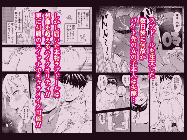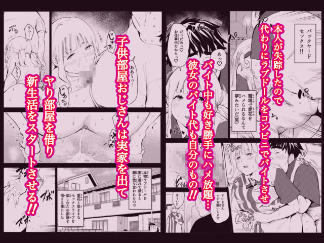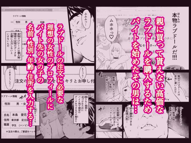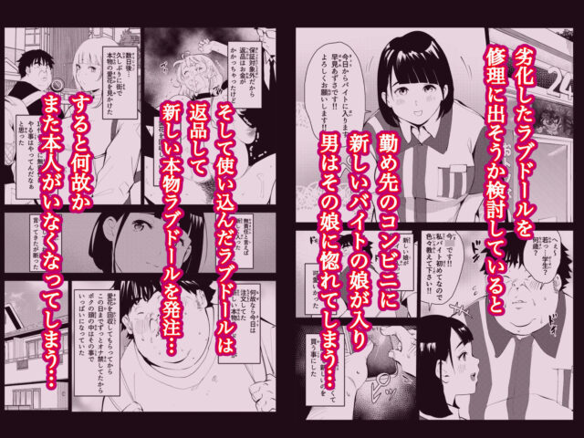 お客様の理想の相手をラブドールにしてみませんか? STORY 引きこもりの子供部屋おじさんの本中生太郎(ほんなかなまたろう)はラブドールが欲しくて社会復帰 コンビニでバイトを始める バイト先のコンビニで、学生バイトの本条愛花(ほんじょうまなか)と出会い一目惚れ… しかし30過ぎのおじさんバイトが○○代の女の子と付き合えるはずもなく 男は【本物ラブドール】を注文する際 バイト先で入手した本条愛花の個人情報を入力し、発注… すると数日後、本条愛花が無断でバイトを休み連絡が取れなくなる… ラブドールを注文した本中生太郎のところには まるで本条愛花本人みたいなラブドールが届く 女性経験のない男はラブドールを早速使用 それからいつでもどこでもパコパコ生活が始まる ラブドールに自分と同じコンビニでバイトさせて仕事を押し付け お客さんがいないときはバックヤードセックス… 更にバイト代も自分のものとし遂に実家を出て自立 男の自信を取り戻し性交渉の回数も増えていく そして数ヶ月後… ラブドールのお腹がでてきて更に母乳のようなものがでるようになり ラブドールなのにまるで妊娠したかのようになってしまう 愛花の性器もけつあなもゆるくなっていたのでメーカーに問い合わせ修理を頼もうと考えていると コンビニに新しいバイトの学生が入る 愛花の体に少し飽きてきた本中生太郎は修理ではなく返品して新しいラブドールを注文する事に すると何故か注文後、新しく入ったバイトの学生と連絡が取れなくなり 男の元には新しいラブドールが届く… 「こんなにクオリティの高いラブドールどうやって作っているんだろう?」