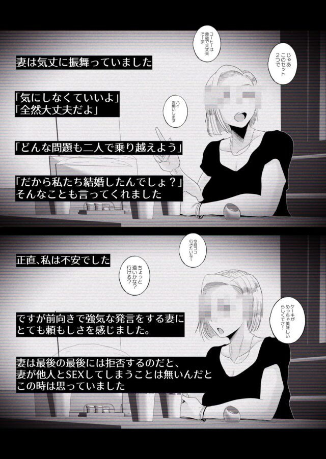 ※ご注意 この作品は「妻にモザイク」を加工・再編したスピンオフ作品となっております。 本編と同様の内容ですが、動画風の加工がされており顔全体にモザイク処理されています。 作品内で発売された【個人撮影動画】という設定ですので、ご理解ください。 =================================== 【動画の内容】 これは私の妻が友人と寝取られSEXする過程を記録した動画になります。 なぜこのような事をする事になったのかといいますと、全て私に原因があることです。 身バレ防止のため詳細は言えませんが、私が友人に借りを作ってしまったということになります。 友人は私を助けてくれましたが、その見返りにこの動画撮影を持ち掛けられました。 私は最初拒否しましたが、友人の「SEXはしなくていい」「過程だけを見せてくれ」という言葉がありました。 妻にこの話をすると迷っていましたが最終的に了承し、協力してくれました。 動画撮影当日、私は外出して友人が家に来ることになっていました。 なので私は妻と友人の間に何があったのか知ることができませんでした。 しかし動画を見て驚愕してしまいました。妻と友人はSEXしていたのです。 まさか妻が他人とSEXしているのを見てこんなに興奮するとは思いませんでした。 最近はレス気味だったのですが妻がこんなにエロいのかと再確認させられました。 私自身、何度この動画で自慰行為をしたか分かりません。 この動画はそれを記録ものになります。 【ご注意】 当方プロではありません。素人による動画撮影・編集になります。 ですので手ブレや、一部不鮮明な箇所、音声が途切れる部分があります。 ご理解の上、ご了承いただける方だけご購入をおねがいします。 二次使用、第三者への提供または転売、転載等は一切禁止します。 法令の基づきモザイク処理を施しておりますことを了承ください。 またプライバシー保護の為、顔全体にもモザイク処理しております。 以上のことをご理解の上、お楽しみいただけると幸いです。 ※諸事情により誠に勝手ながら動画を削除させていただく場合がございます。 #個撮 #個人撮影 #寝取られ #NTR #嫁晒し =================================== モノクロ59ページ (表紙1ページ含む)