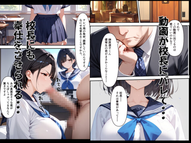 「こんなやつとキスするなんで・・・絶対に嫌なのに・・・」 【ストーリー】 同級生の彼氏を守るため榊原凛子は不良の都合の良い性奴●になっていた。 あるときは学校の男子トイレでフェラチオを強要され、あるときは彼氏と海にデート中に外で無理やり・・・ 不良の小遣い稼ぎのために個人制作のAVに出演することになり、下品な女を演じるが次第に役にのめり込んでいく。 しかしそんなとき、AVが学校の校長にバレてしまい、ついには校長にまで脅迫されるように・・・。 ついに不良との関係を断つために最後のセックスを行うが・・・。 カノジョは不良の毒牙から逃れることができるのか? ページ数:95ページ (本編94ページ、あとがき1ページ) 前作「ボクを守るために不良の性奴●になっても絶対に堕ちないカノジョ」の続編になります。 今作のみでも楽しめるようになっておりますが、できれば前作からお読みください 【登場人物紹介】 【主人公】 本作の主人公。幼馴染の榊原凛子と相思相愛の仲。 自分より成績の良い凛子と同じ大学に進学するために勉強を頑張っている。 凛子とは大学進学後にエッチなことをしようと約束している。 童貞。 【凛子】 本作のヒロイン。主人公と相思相愛の仲。成績優秀でクラスのアイドル。美人で巨乳なので男子生徒、教師からはオナペットにされている。 処女は主人公に取っておいたが、前作で不良に処女を奪われた。非処女。 【不良】 主人公をいじめていた。主人公をいじめる代わりに、凛子に性欲処理をさせている。女にもて、泣かせてきた女は数しれない。趣味は筋トレ。 【校長】 以前は体育教師をしていた。校長としては有能で性格も温厚なため、周りからの人望は厚いが、学生を脅迫して性処理をさせるのが趣味のサディスト。 以前から凛子には目をつけており、脅迫する材料を探していた。 【無料ページ】 16ページまで体験版ダウンロードで無料で読めます ※本作品にはStable DiffusionによるAI生成画像を使用しています。 Pixivでも体験版と同様に試し読みできます。新作の告知も行っております。是非フォローお願いします。 Pixiv ID @user_kyfn2544